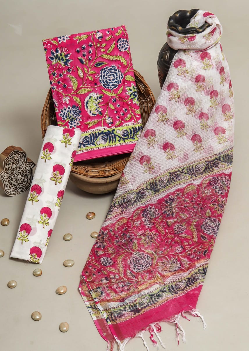 DESIGNER HAND BLOCK PRINT PURE COTTON SUIT MATERIAL WITH KOTA DORIA DUPATTA (3CKDYS84)