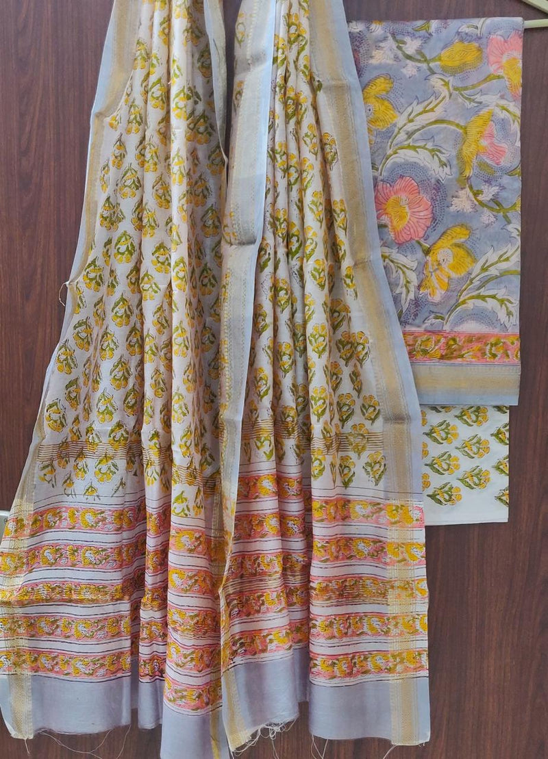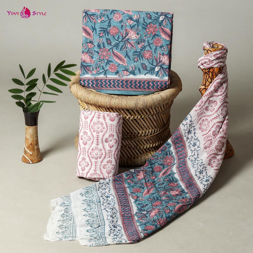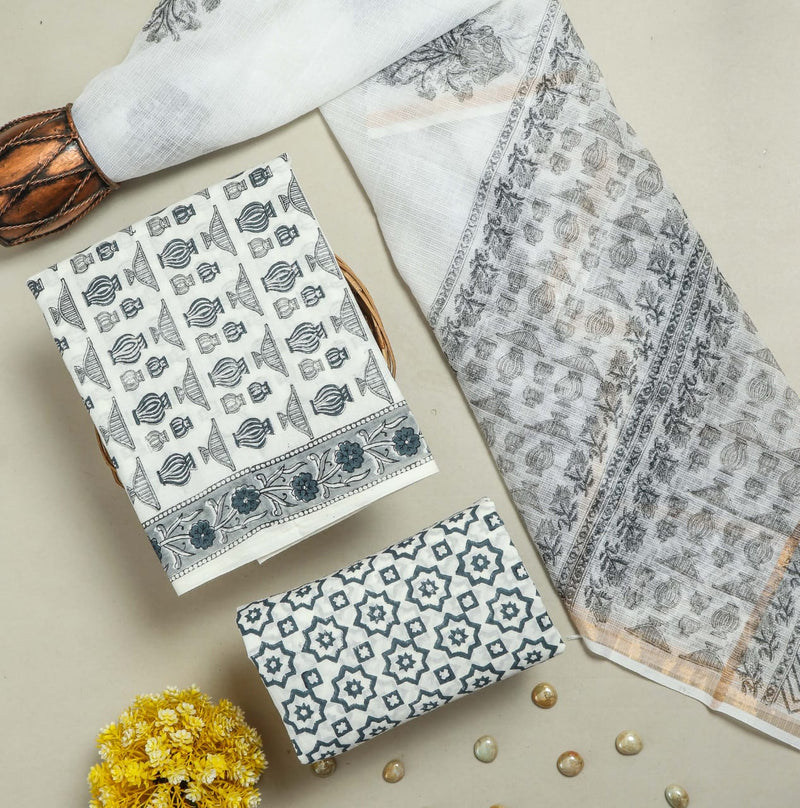 DESIGNER HAND BLOCK PRINT PURE COTTON SUIT MATERIAL WITH KOTA DORIA DUPATTA (3CKDYS49)