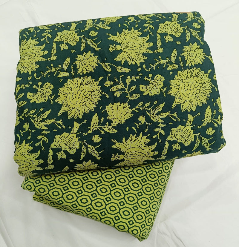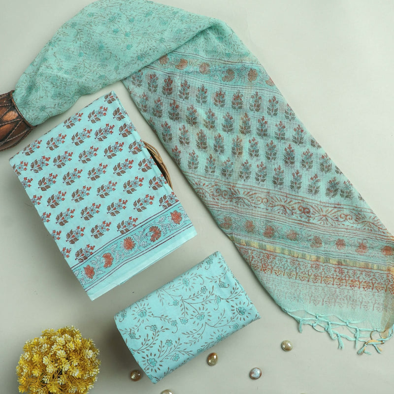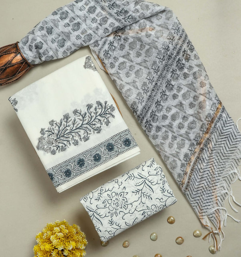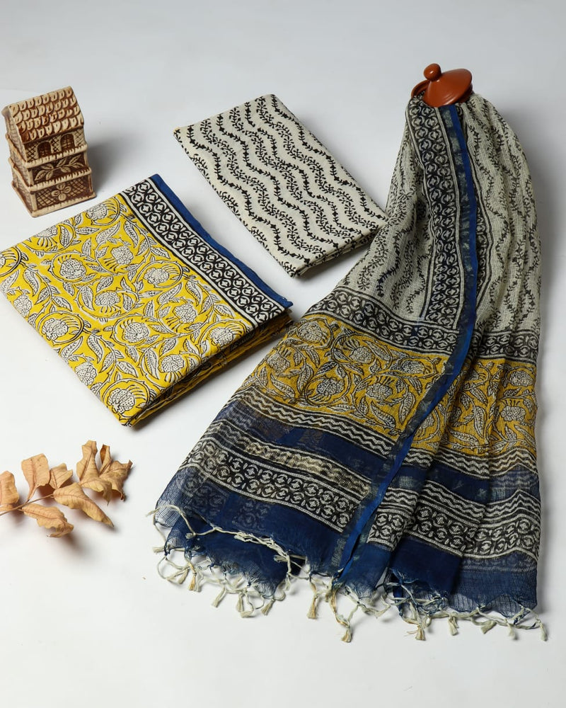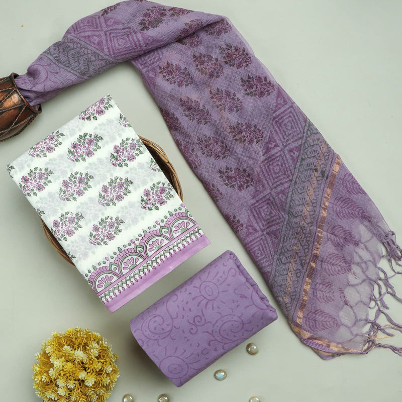 Appealing Floral Hand Block Print Cotton Suit with Kota Doria Dupatta (3CKDYS207)