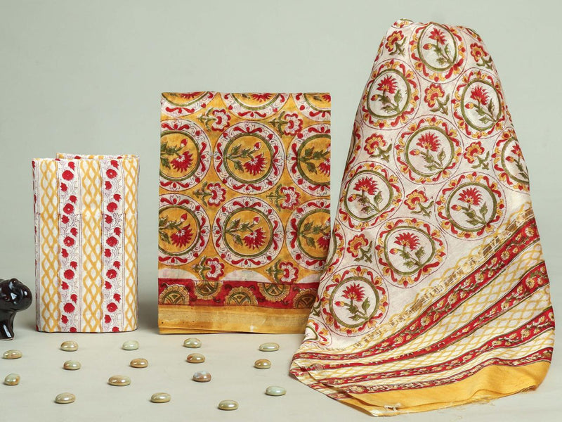 DESIGNER HAND BLOCK PRINT CHANDERI SILK SUIT SET WITH PREMIUM CHANDERI DUPATTA (CHDYS42)