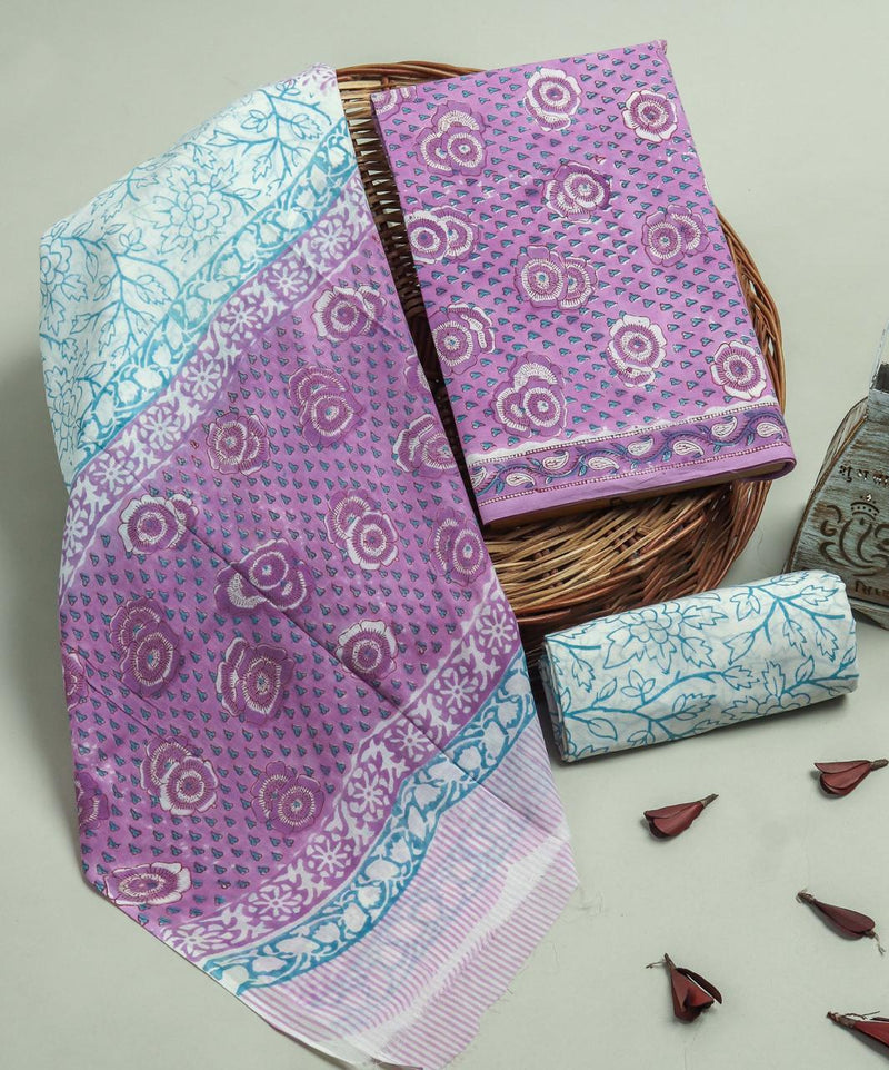 Designer Hand Block Print Pure Cotton Suit Material with Kota Doria Dupatta (3CKDYS08)