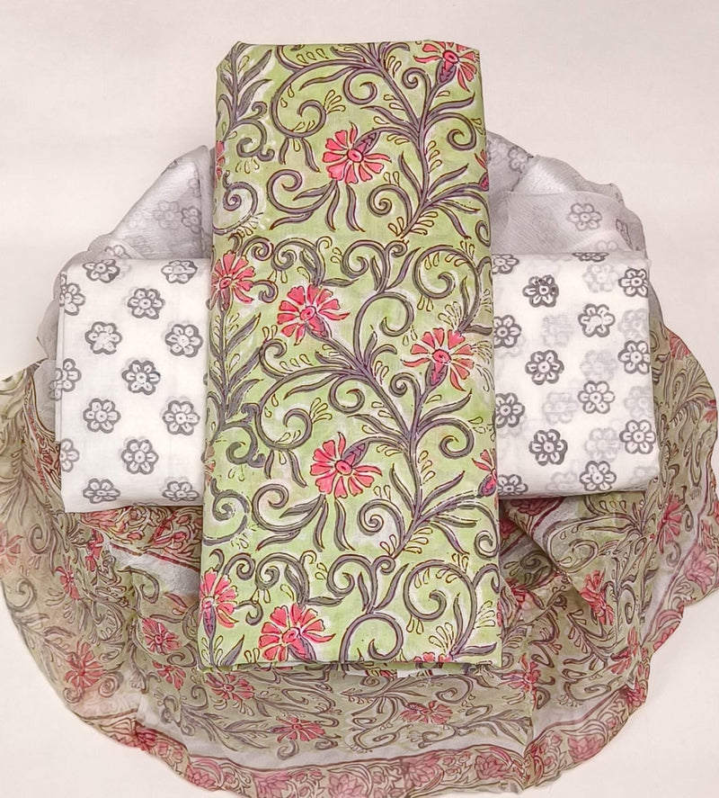 TRADITIONAL HAND BLOCK PRINT PURE COTTON SUIT WITH CHIFFION DUPTTA (PCHFYS154)