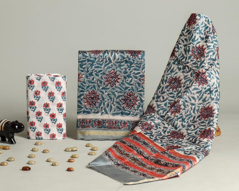 ELEGANT HAND BLOCK CHANDERI SILK SUIT SET WITH CHANDERI DUPATTA (CHDYS241)
