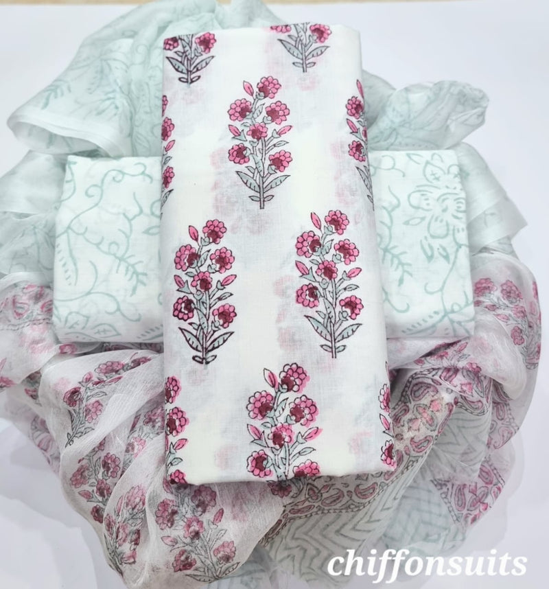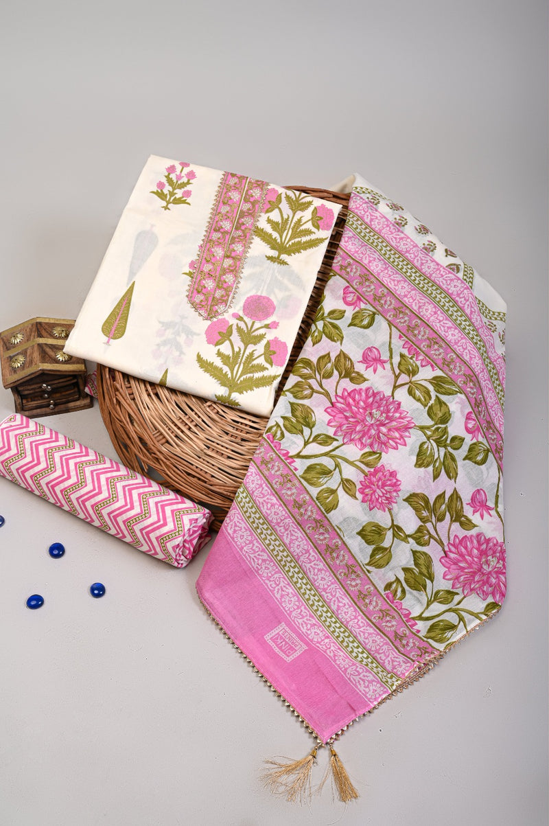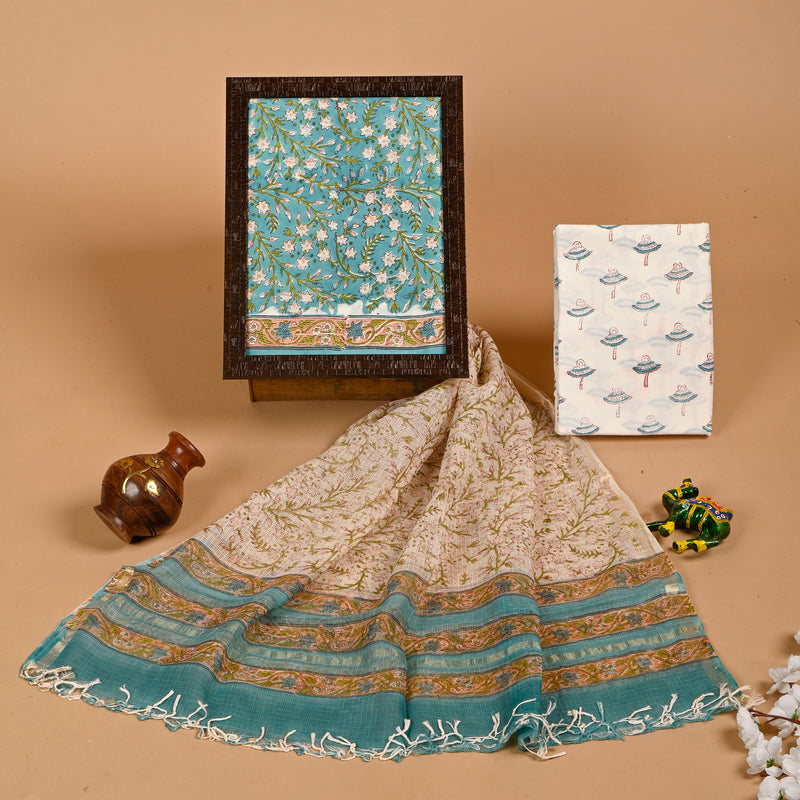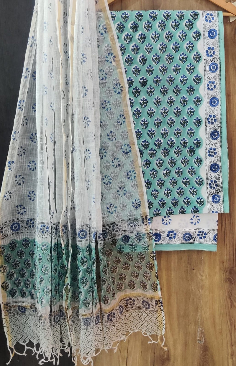 Appealing Floral Hand Block Print Cotton Suit with Kota Doria Dupatta (3CKDYS207)