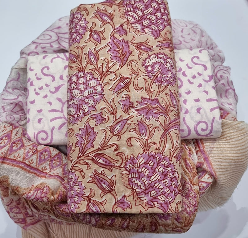 DESIGNER HAND BLOCK PRINT PURE COTTON SUIT MATERIAL WITH KOTA DORIA DUPATTA (3CKDYS36)