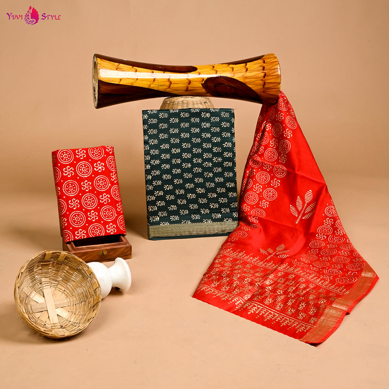 TRADITIONAL HAND BLOCK BAGRU PRINT CHANDERI SILK SUIT SET WITH PREMIUM CHANDERI DUPATTA (CHDYS307)