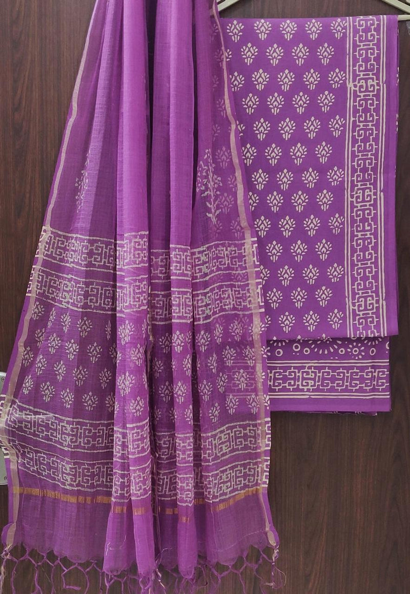 ELEGANT HAND BLOCK CHANDERI SILK SUIT SET WITH CHANDERI DUPATTA (CHDYS268)