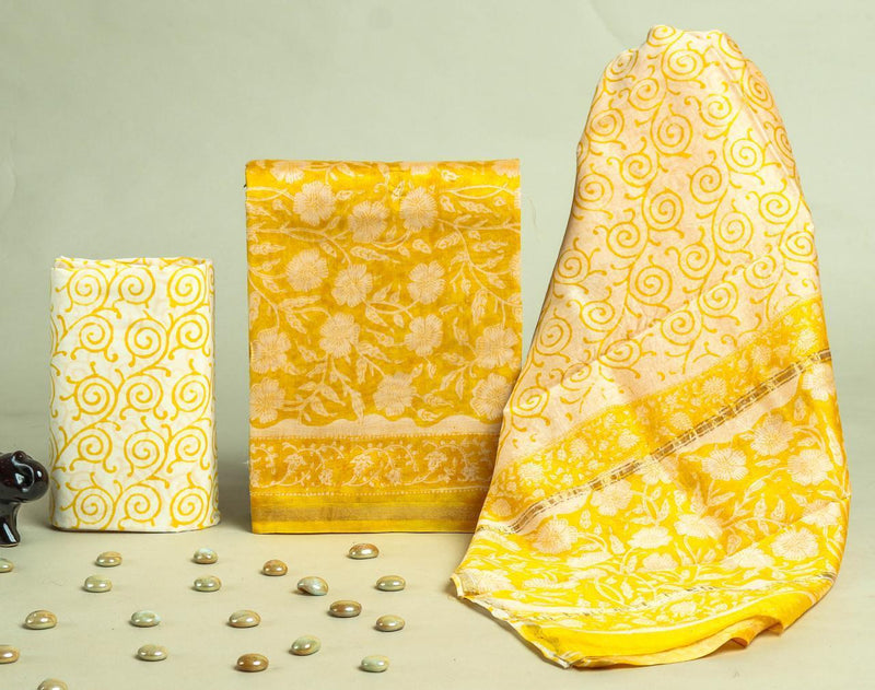 TRADITIONAL HAND BLOCK CHANDERI SILK SUIT SET WITH CHANDERI DUPATTA(CHDYS150)