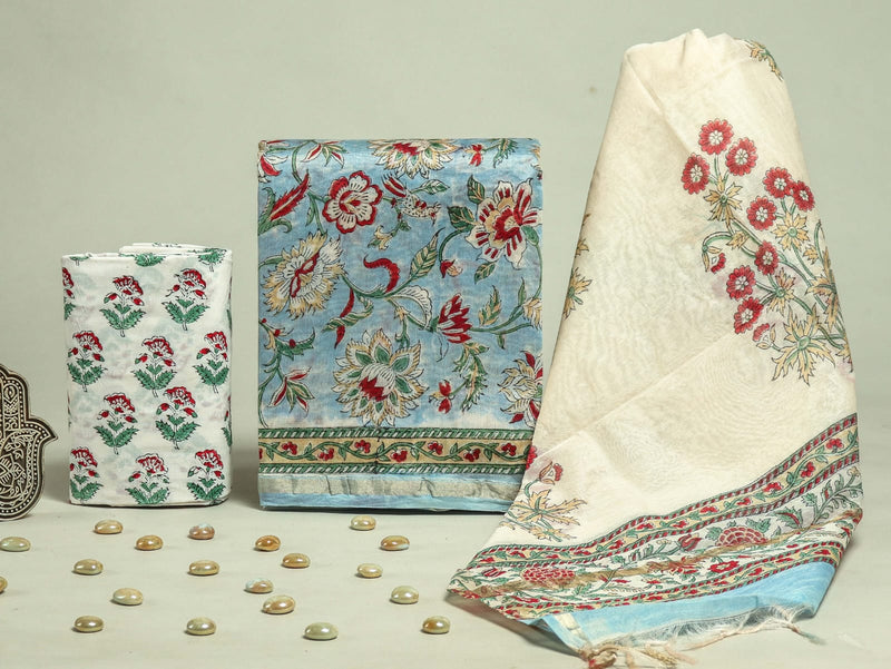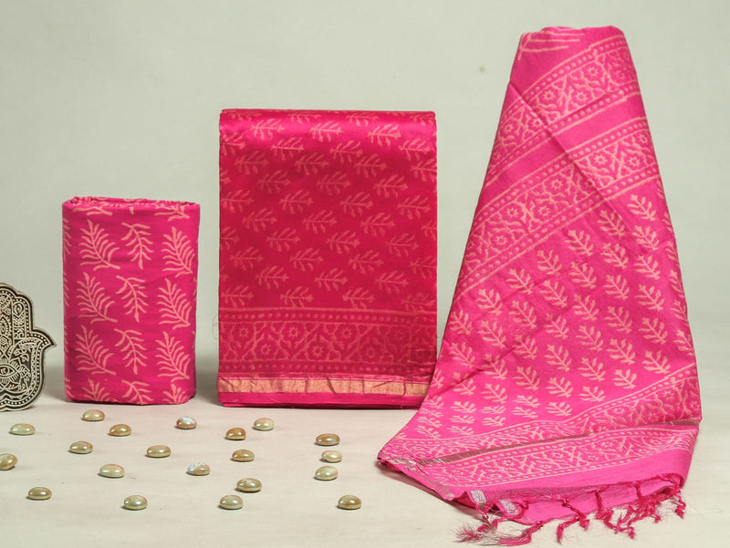 Save 43%DESIGNER HAND BLOCK PRINT CHANDERI SILK SUIT SET WITH PREMIUM CHANDERI DUPATTA (CHDYS61)