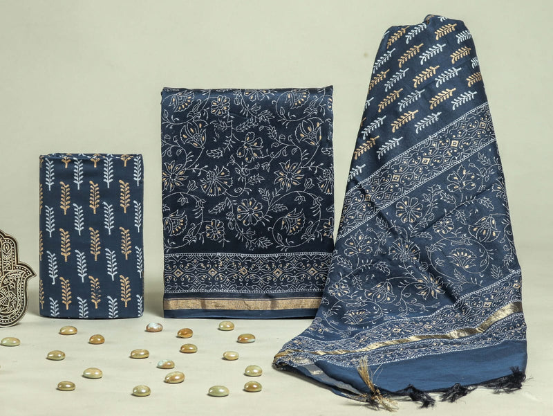 YUVI STYLE AJRAK HAND BLOCK CHANDERI SILK SUIT SET WITH CHANDERI DUPPTTA (CHDYS173)