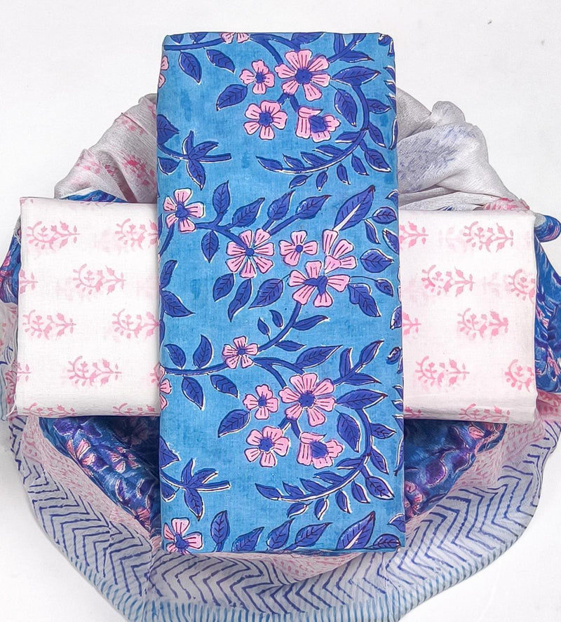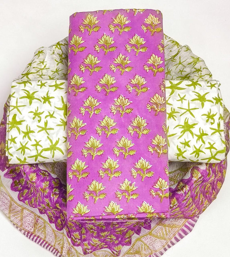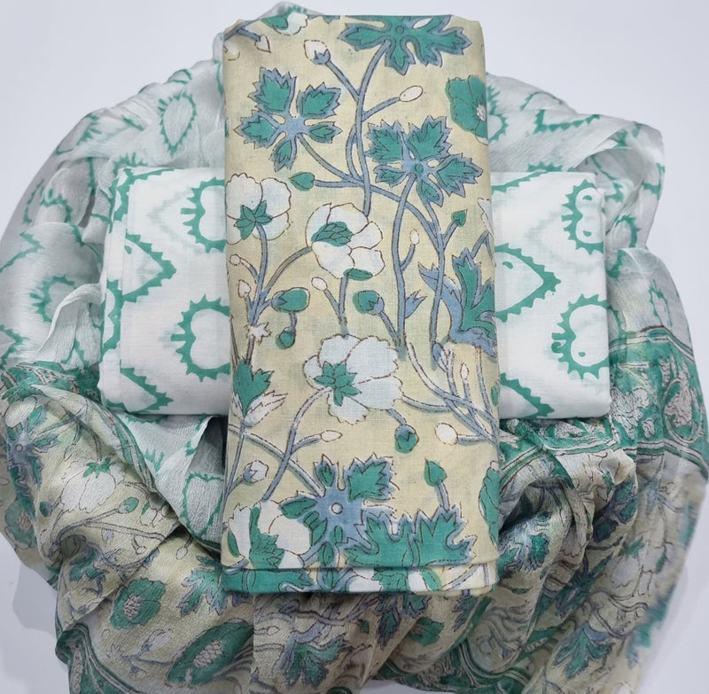 TRADITIONAL HAND BLOCK PRINT PURE COTTON SUIT WITH CHIFFION DUPTTA (PCHFYS151)