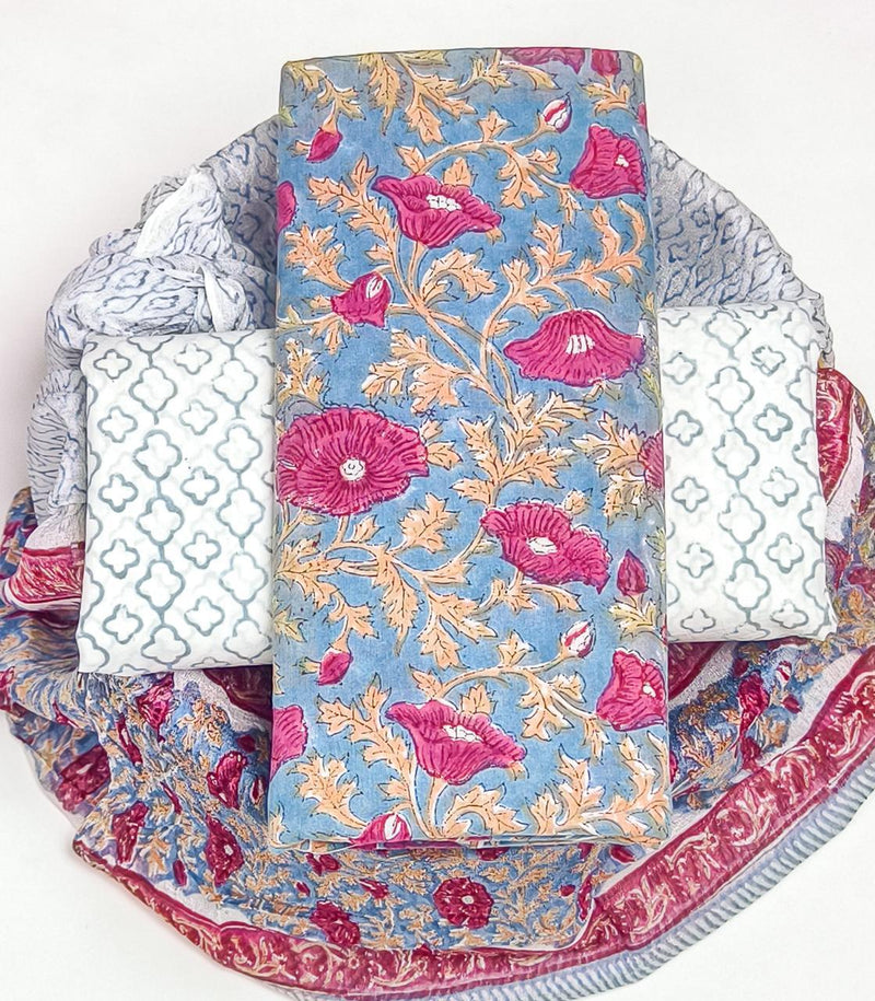 YUVI STYLE HAND BLOCK PRINT PURE COTTON SUIT WITH CHIFFION DUPTTA (PCHFYS105)