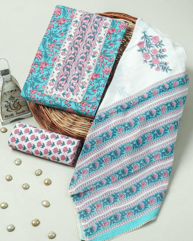 Sanganeri print cotton suit material with cotton dupatta Hand work (GOTAYS102)