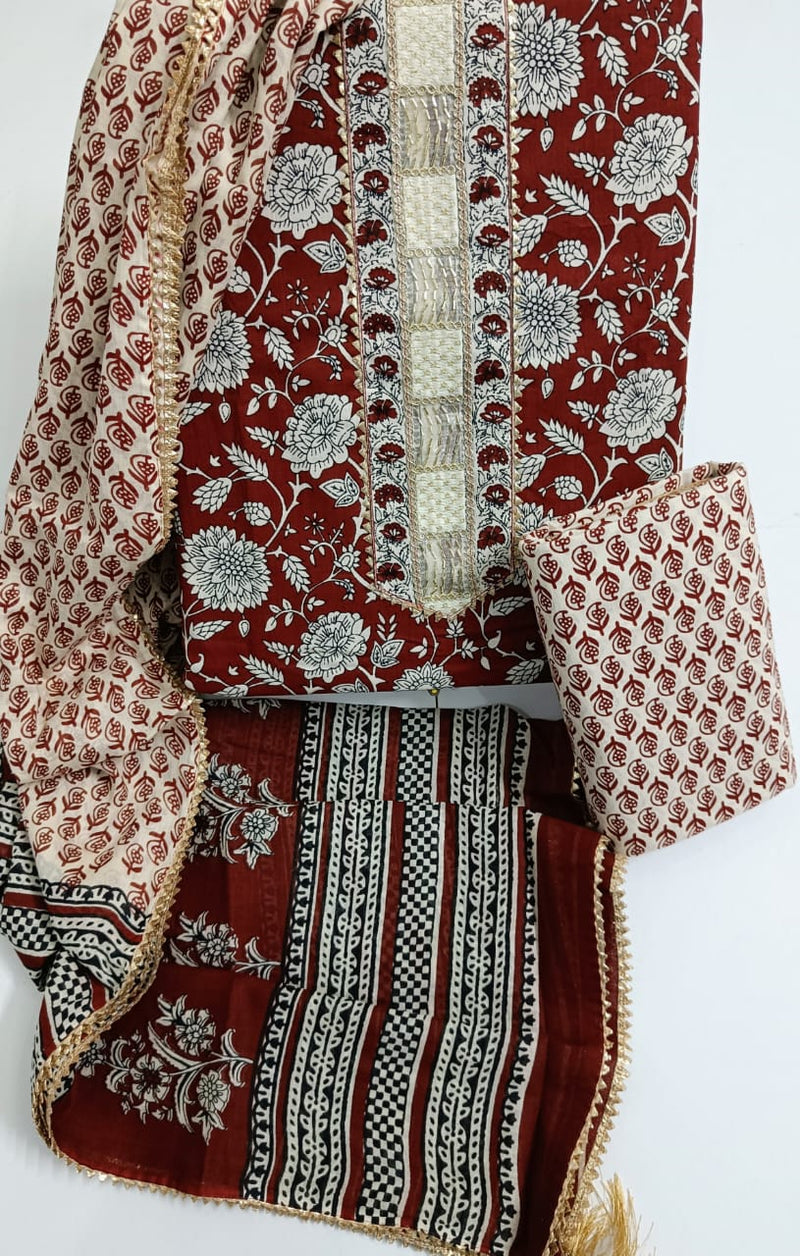 Sanganeri print cotton suit material with cotton dupatta Gotta Tye neck work (GOTAYS28)