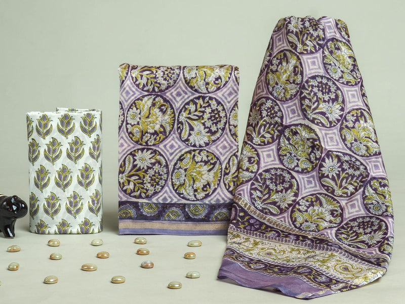 TRADITIONAL HAND BLOCK CHANDERI SILK SUIT SET WITH CHANDERI DUPATTA (CHDYS280)
