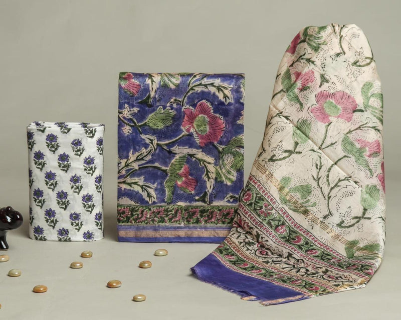 TRADITIONAL INDIGO HAND BLOCK CHANDERI SILK SUIT SET WITHCHANDERI DUPATTA(CHDYS142)