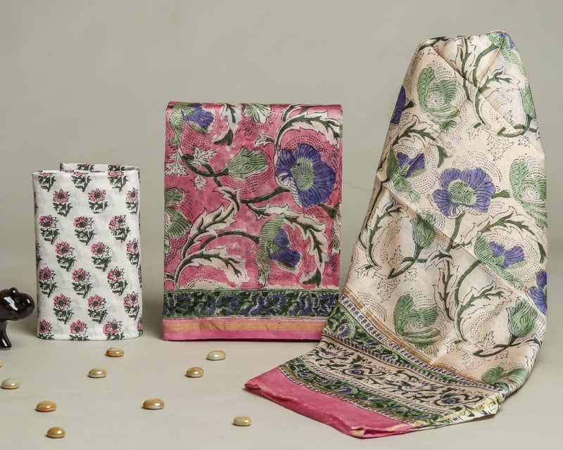 ELEGANT HAND BLOCK CHANDERI SILK SUIT SET WITH CHANDERI DUPATTA (CHDYS160)