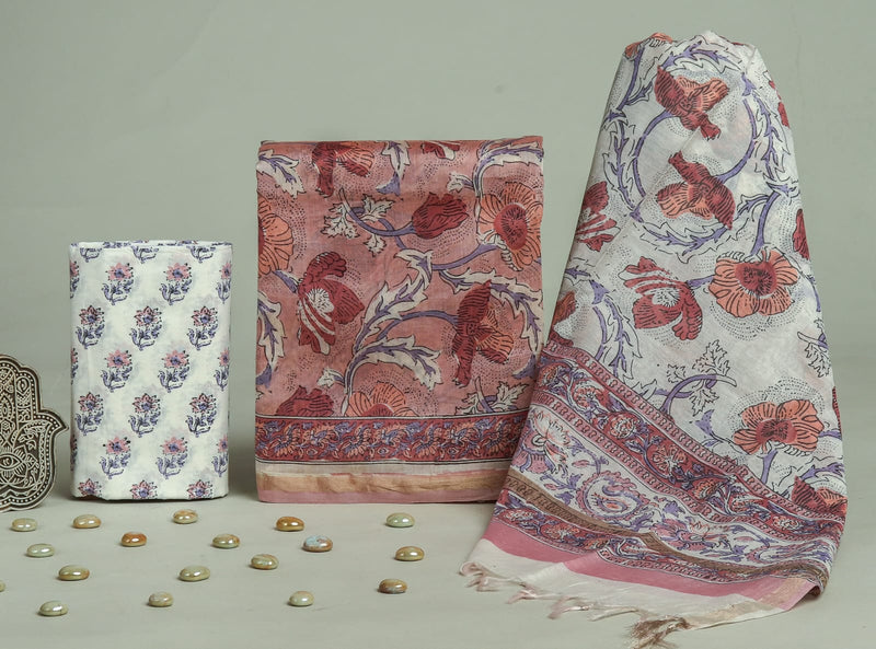 Designer Hand Block Print Pure Cotton Suit Material with Kota Doria Dupatta (3CKDYS18)