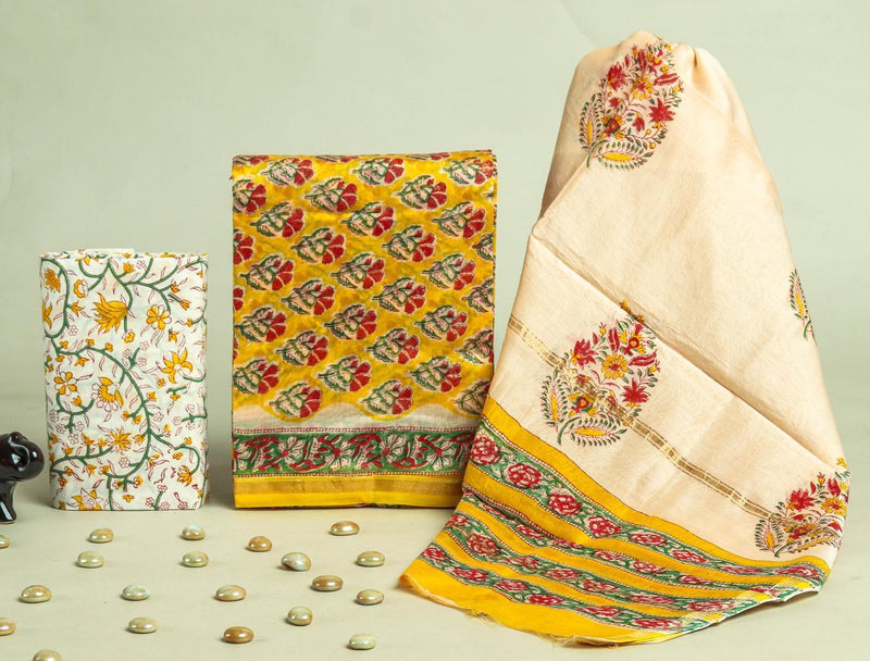 ELEGANT HAND BLOCK CHANDERI SILK SUIT SET WITH CHANDERI DUPATTA (CHDYS270)