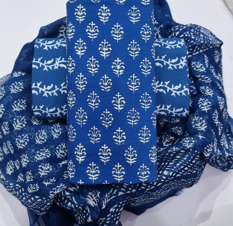 DESIGNER HAND BLOCK PRINT COTTON SUIT SET WITH KOTA DORIA DUPATTA (3CKDYS217)