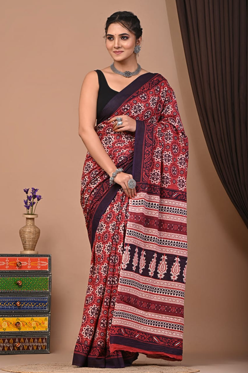 FLOWER PRINT HAND BLOCK PRINT COTTON MULMUL SAREE WITH BLOUSE (CMSYS11)