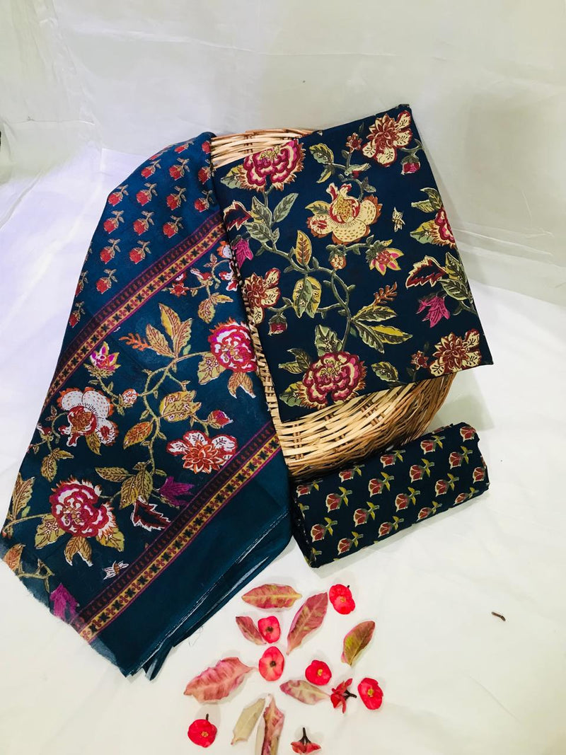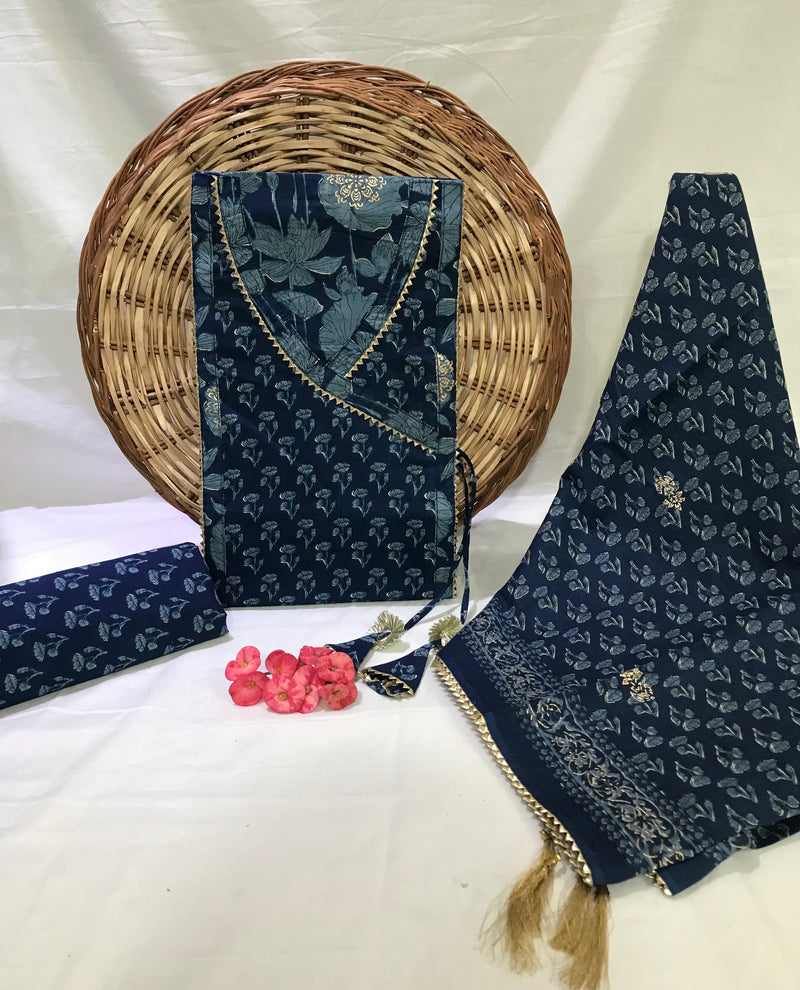 INDIGO HAND BLOCK PURE COTTON SUIT WITH KOTA DORIA DUPATTA 3CKDYS199)