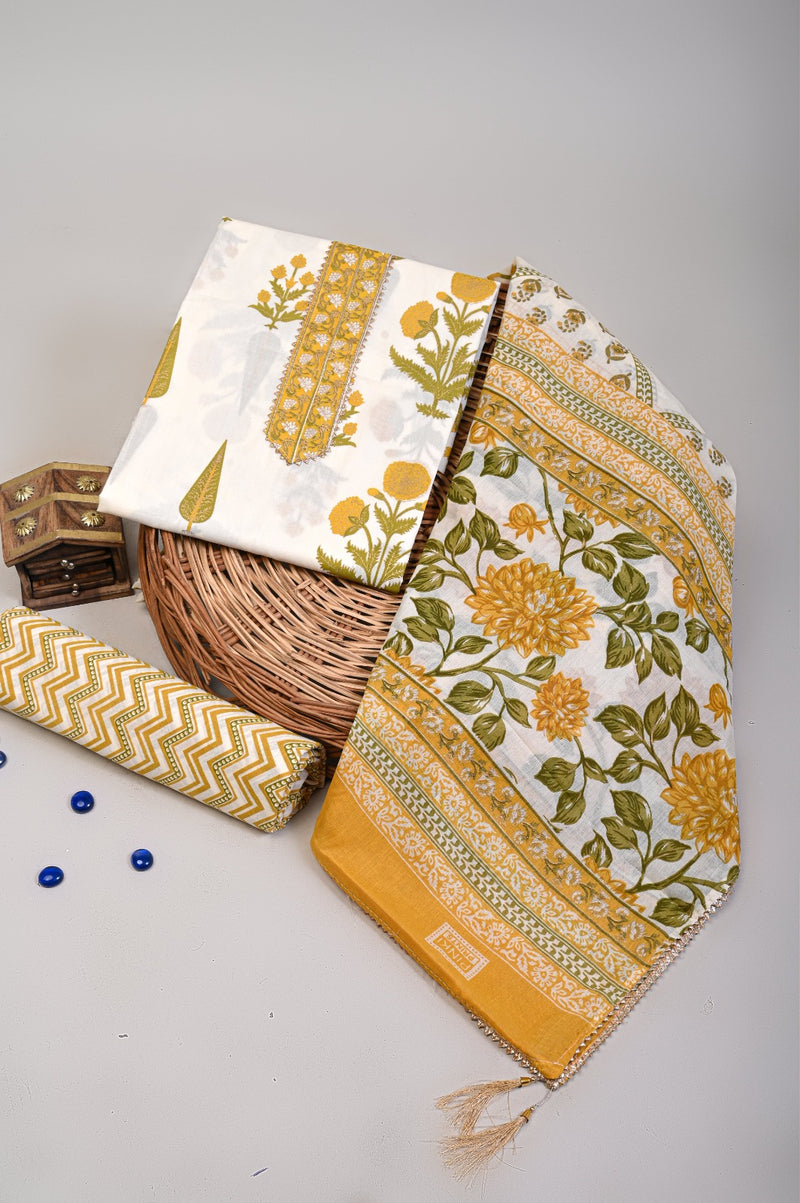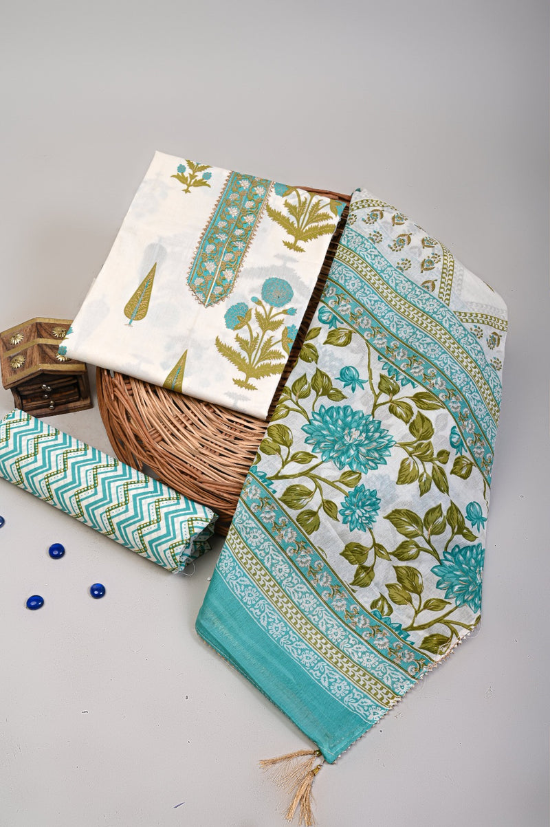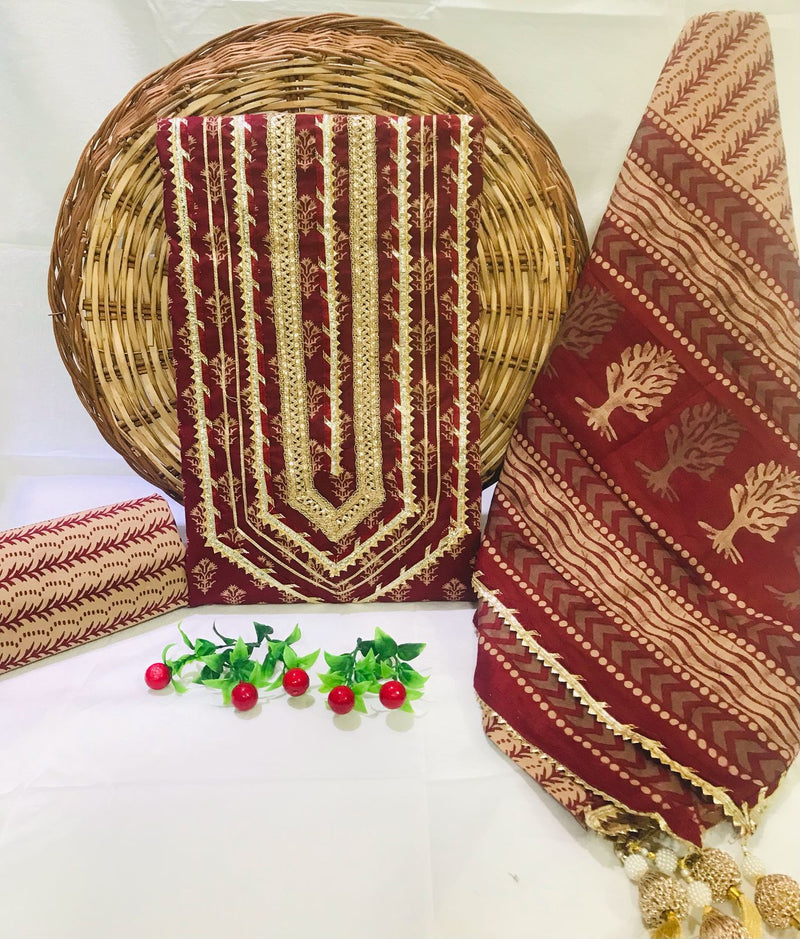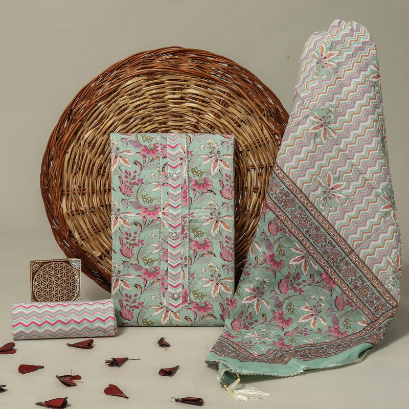 Sanganeri print cotton suit material with mulmul dupatta neck work (GOTAYS52)