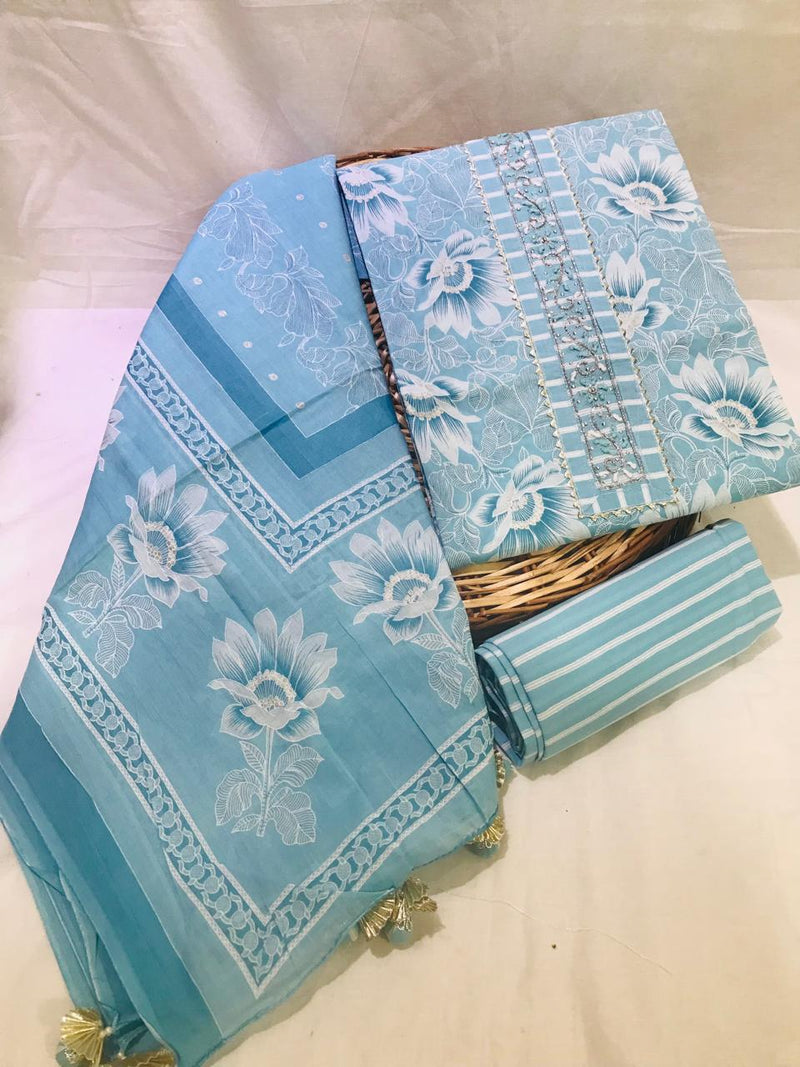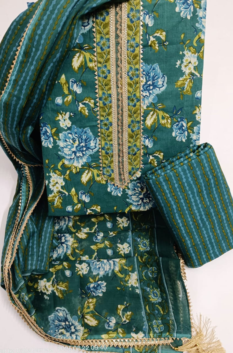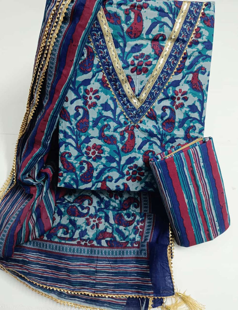 Sanganeri print cotton suit material with cotton dupatta Gotta Neck Work (GOTAYS23)