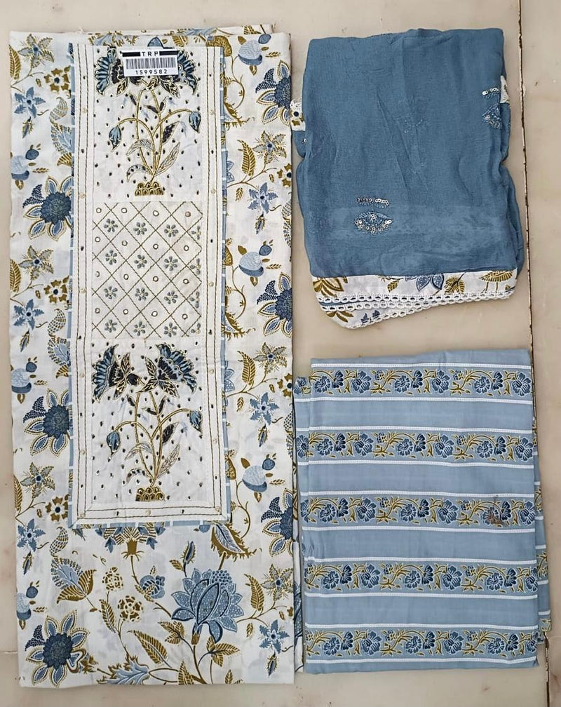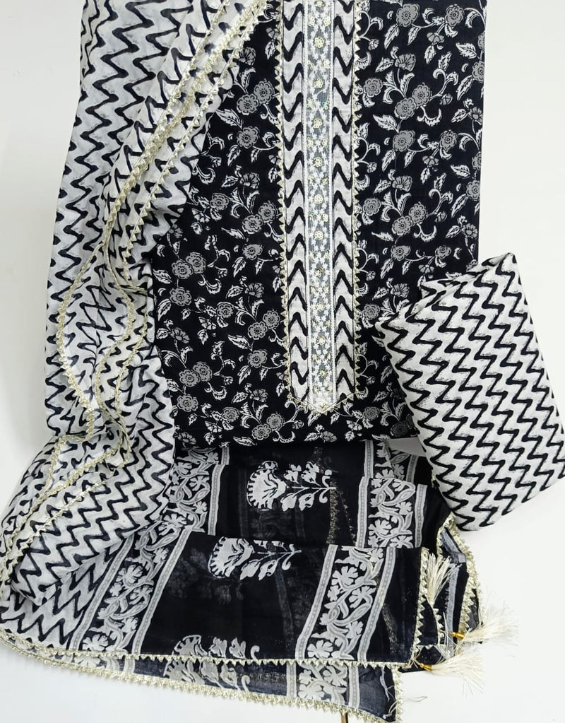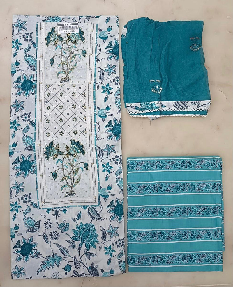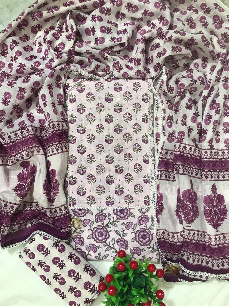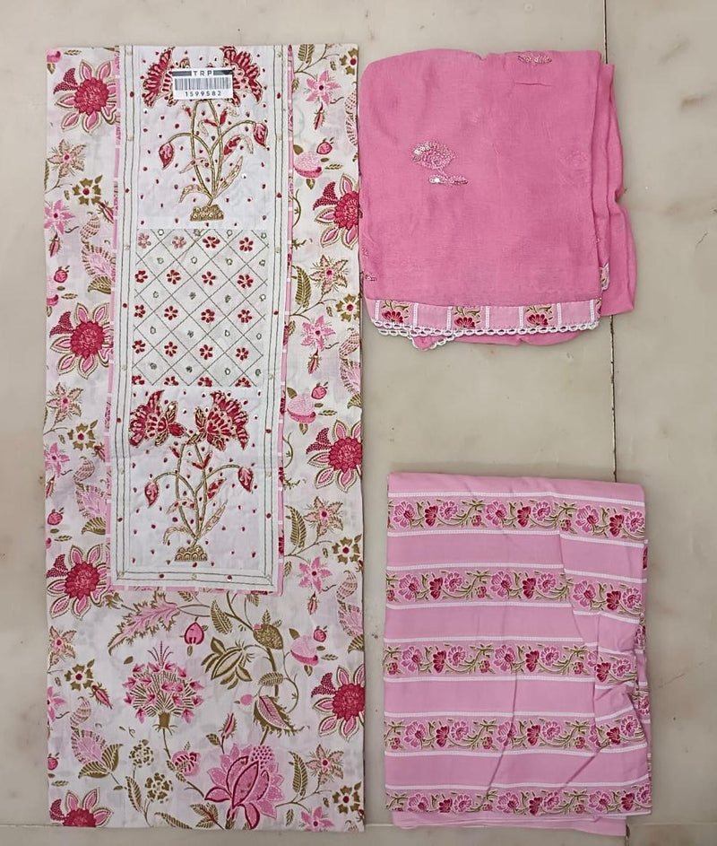 SANGANERI PRINT COTTON SUIT MATERIAL WITH MULMUL DUPATTA HAND WORK (GOTAYS110)