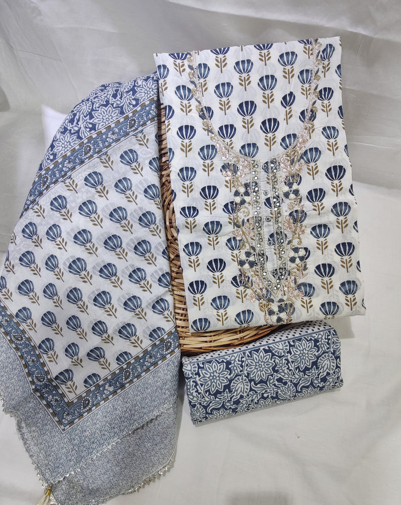 SANGANERI PRINT COTTON SUIT MATERIAL WITH MULMUL DUPATTA NECK WORK (GOTAYS141)