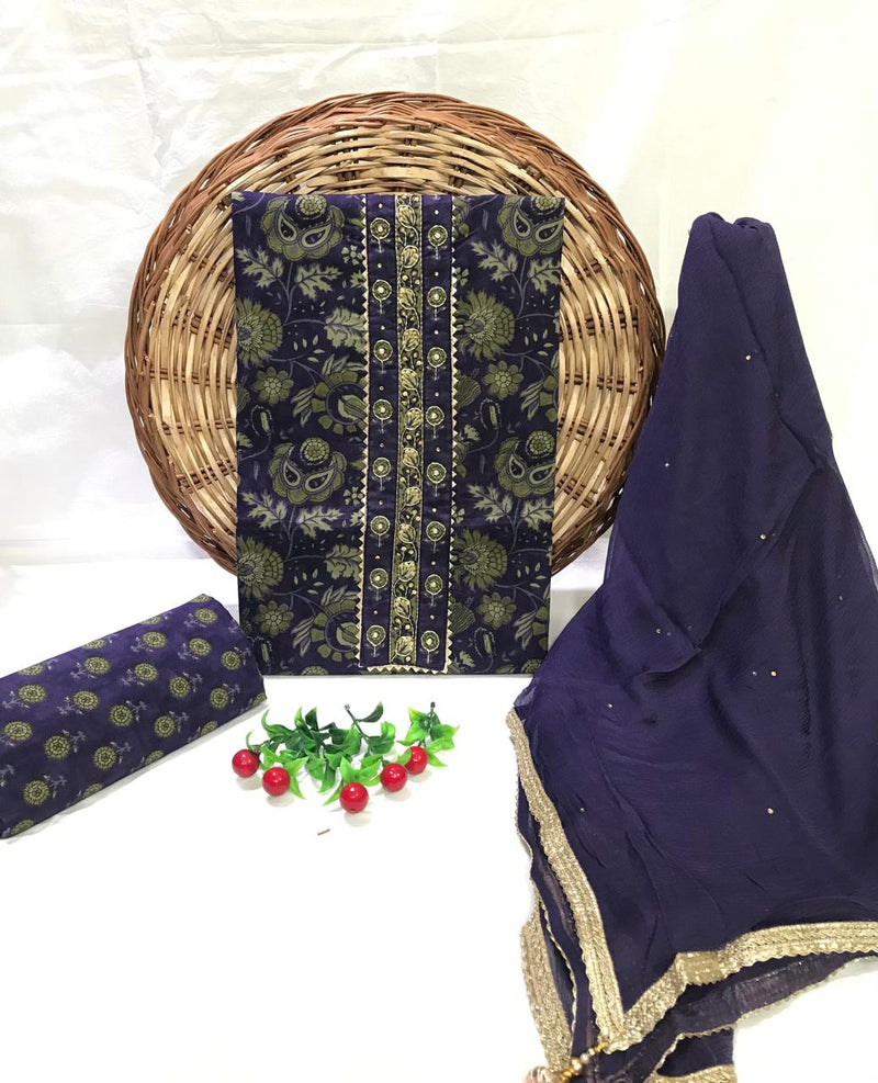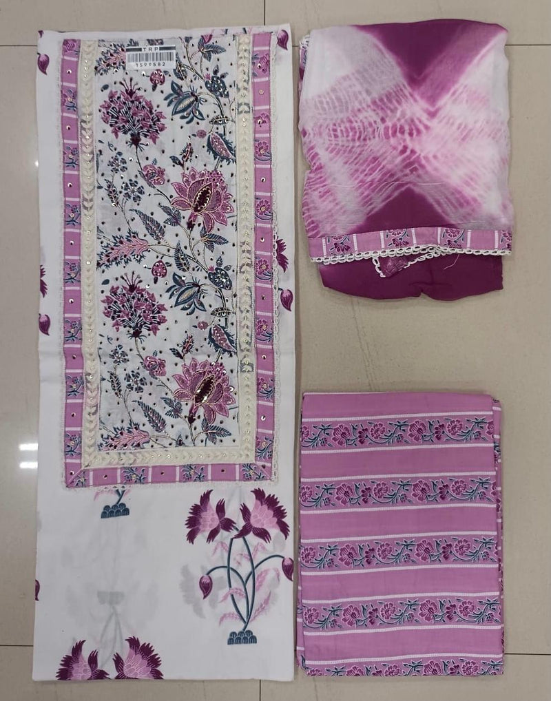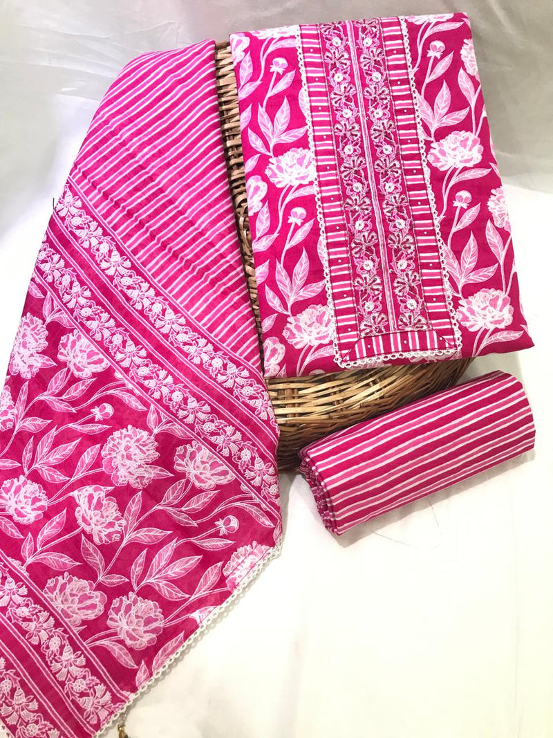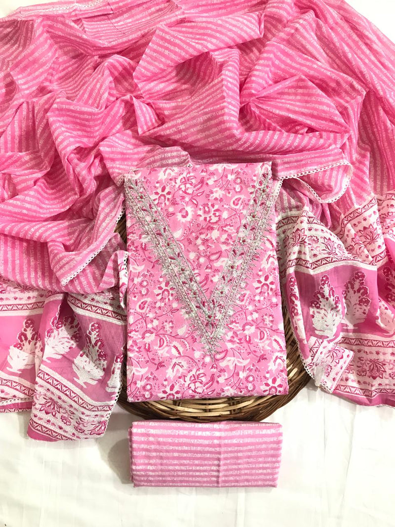 SANGANERI PRINT COTTON SUIT MATERIAL WITH CHIFFION DUPATTA NECK WORK (GOTAYS155)