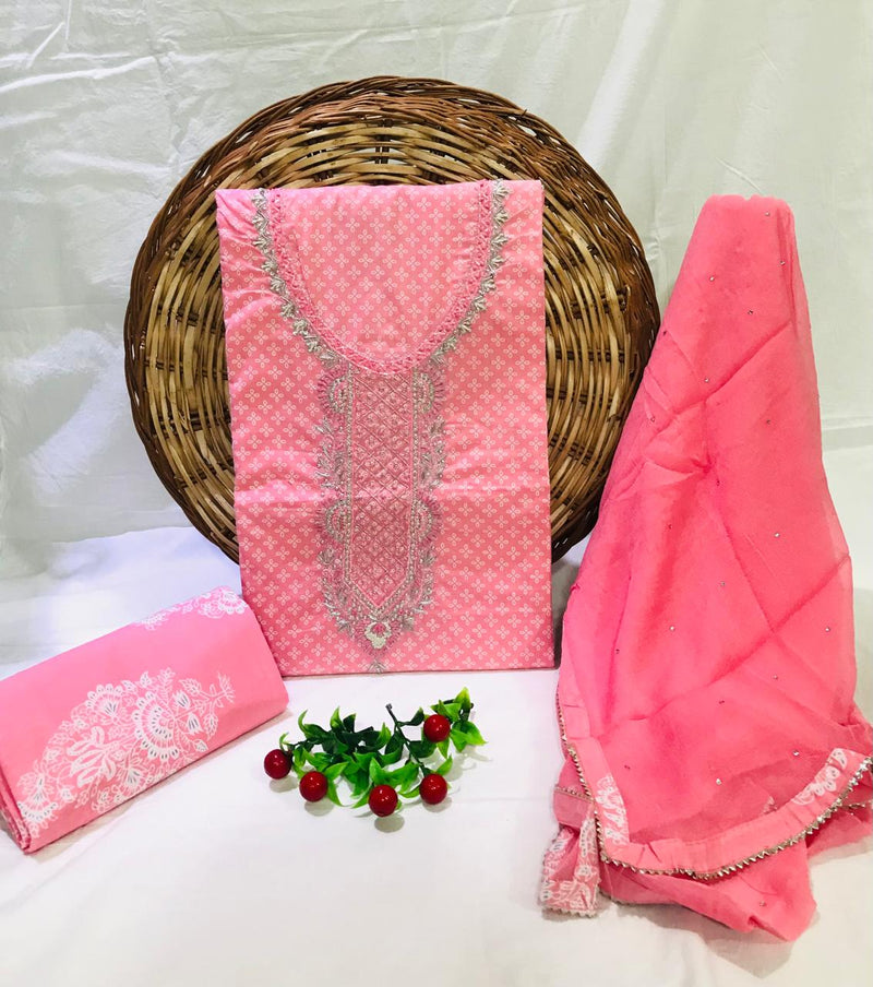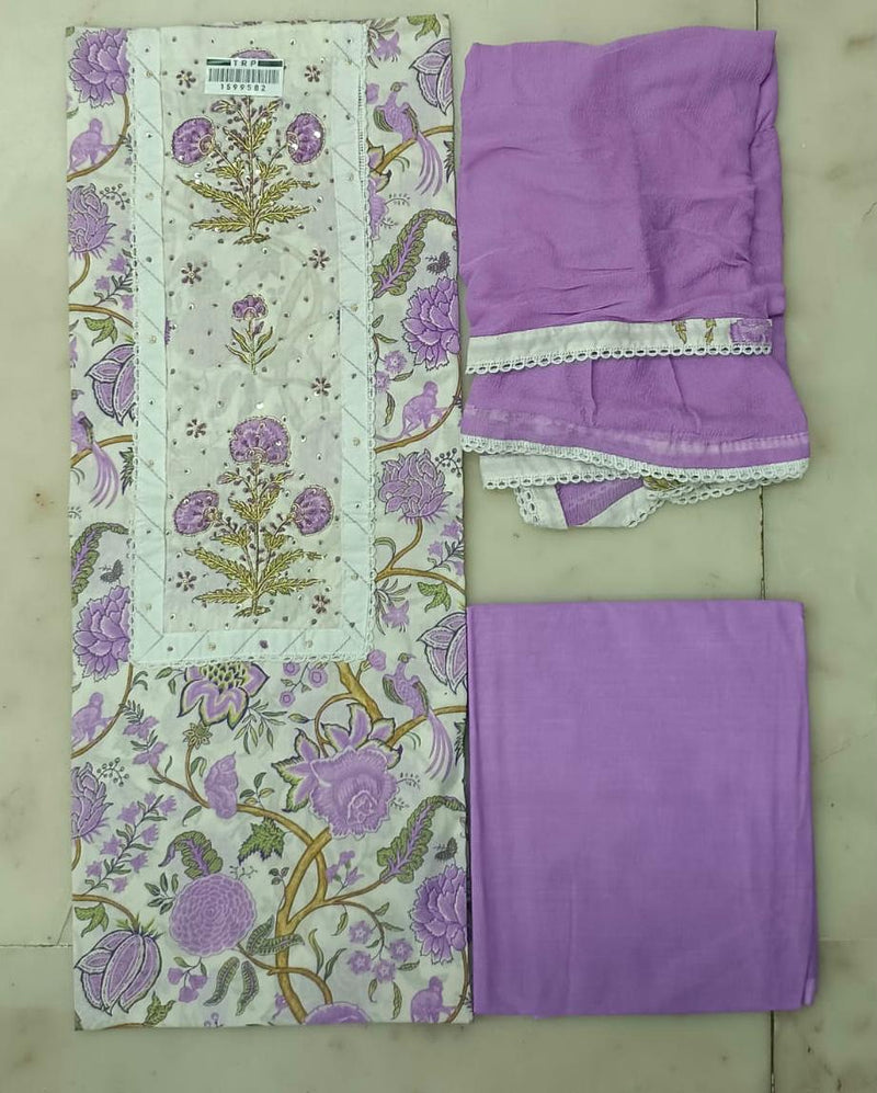 Save 51%SANGANERI PRINT COTTON SUIT MATERIAL WITH CHIFFION DUPATTA  NECK WORK (GOTAYS144)