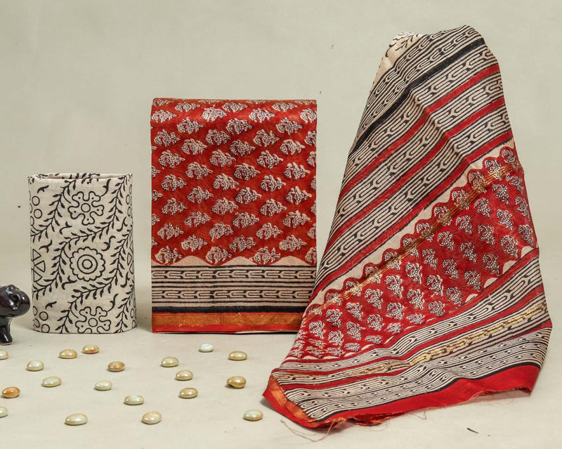 TRADITIONAL HAND BLOCK CHANDERI SILK SUIT SET WITH CHANDERI DUPATTA (CHDYS122)
