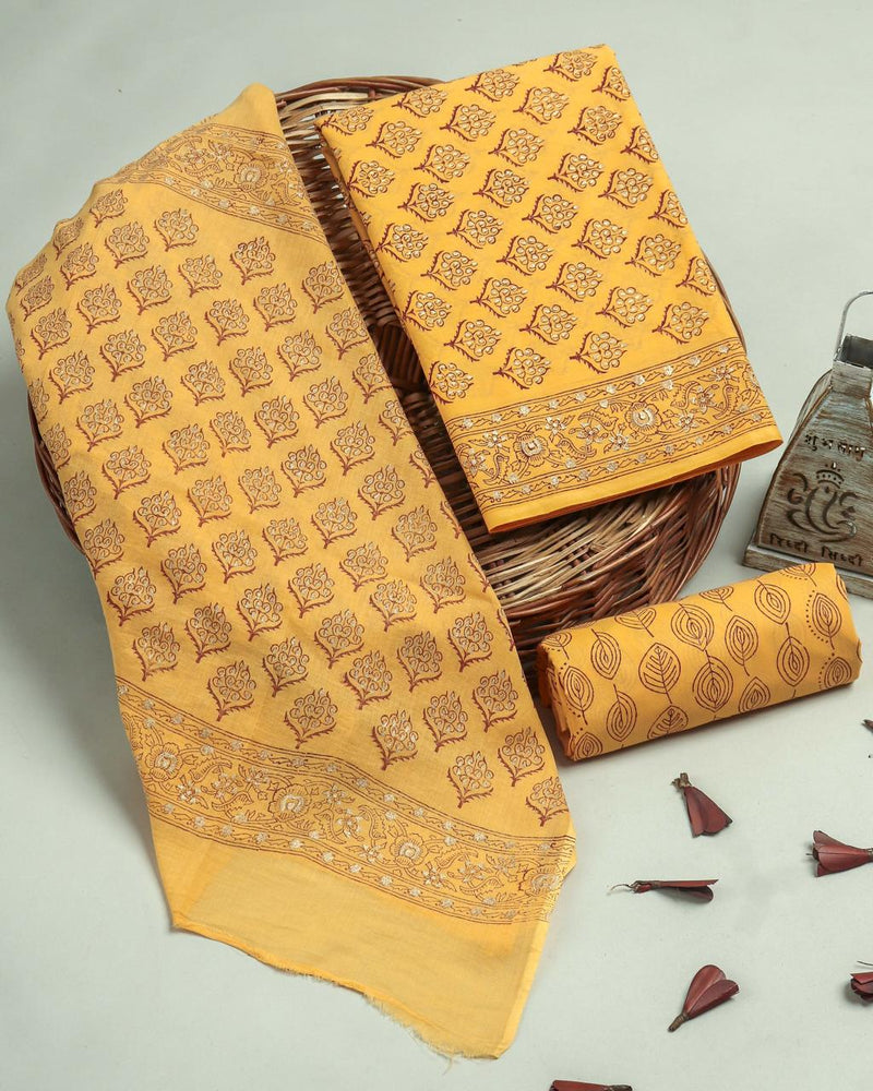Designer Hand Block Print Cotton Suit Set with Mulmul Dupatta (MALYS295)