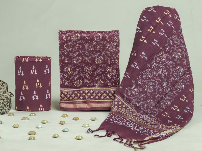 Designer Hand Block Print Mahehwari Silk Suit Set (MSLYS28)