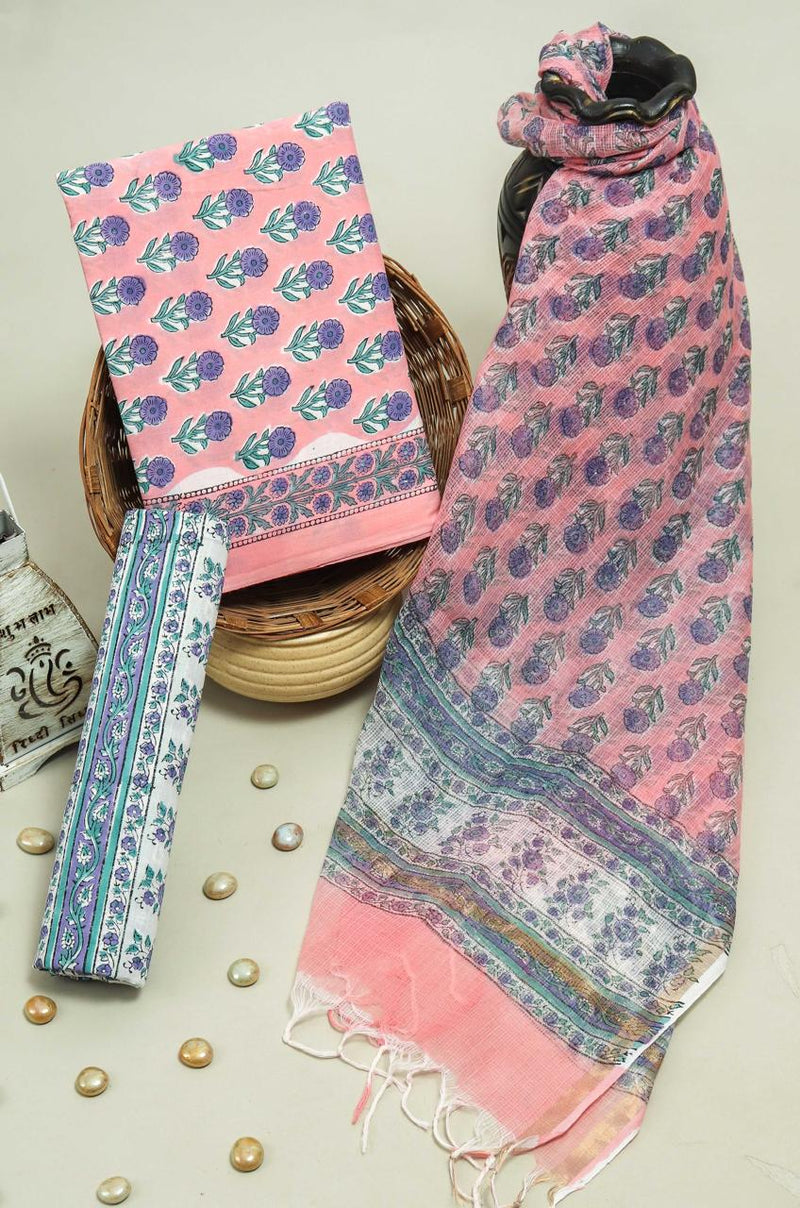 Designer Hand Block Print Pure Cotton Suit Material with Kota Doria Dupatta (3CKDYS17)