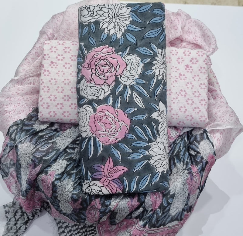 DESIGNER HAND BLOCK PRINT PURE COTTON SUIT MATERIAL WITH KOTA DORIA DUPATTA(3ckdys60)